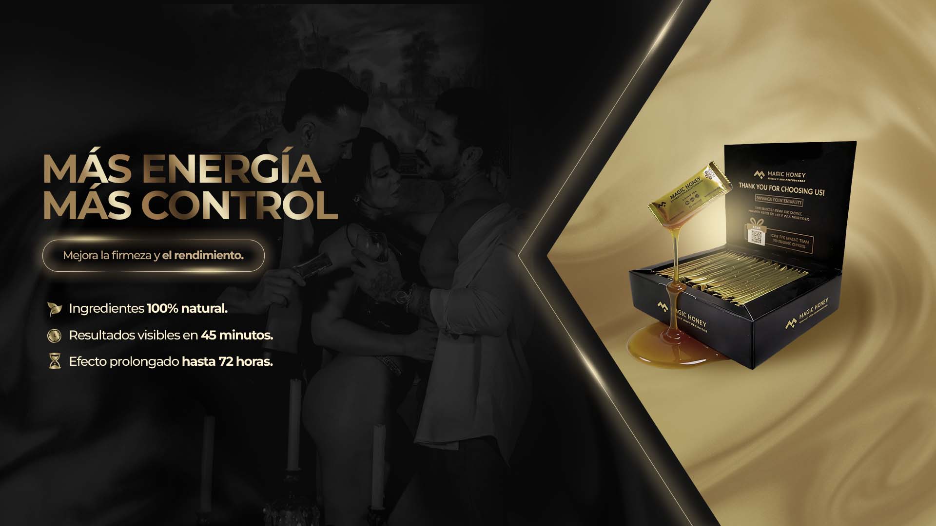 Con el paso del tiempo, los niveles de testosterona y energía disminuyen, lo que puede afectar el deseo y el rendimiento físico. Magic Honey ayuda a: